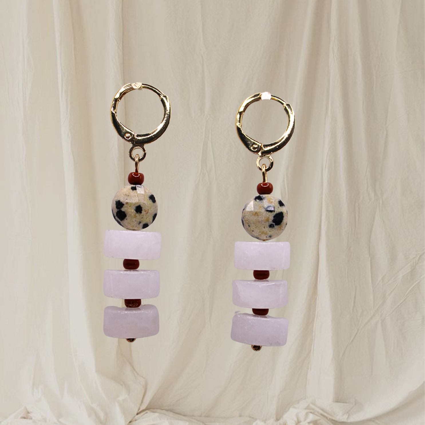 The Margo Hoops are dainty lightweight earrings made with Dalmatian jasper, genuine quartz stone beads, and hypoallergenic nickel free hardware (stainless steel).