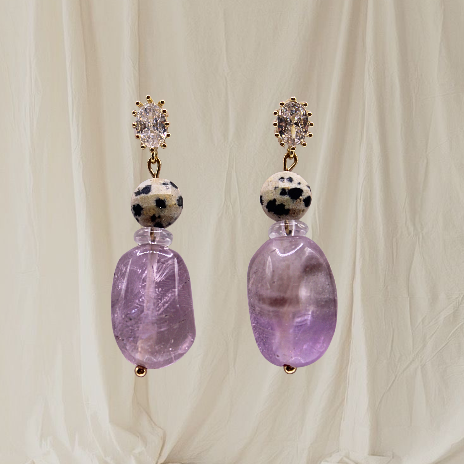 These one of a kind earrings are made with polished amethyst stones, Dalmatian jasper beads, and hypoallergenic stainless steel hardware.