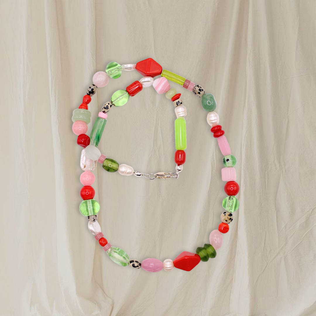 This one of a kind necklace is made with repurposed and vintage glass beads. It features an extension chain at the clasp to provide variety in sizing.